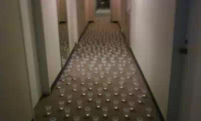 Cover a hallway in cups of water.
